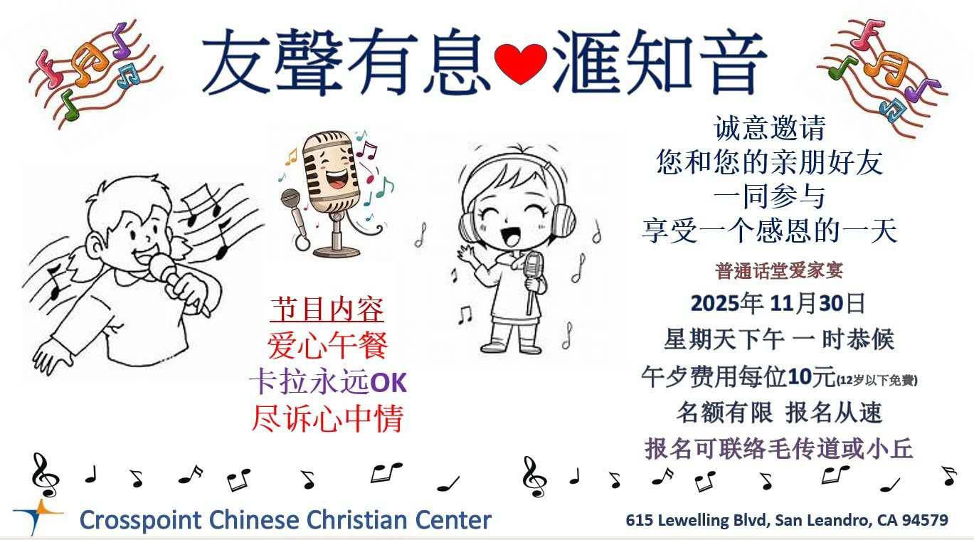 Next Sunday at 11/30 pm, the Mandarin Ministry will have an outreach activity that includes lunch, karaoke, and sharing. Lunch costs $10 per person. Please help invite relatives and friends to attend.