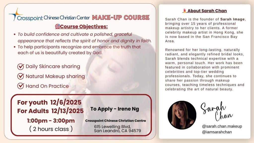 - 12/6及12/13下午1點至3點舉行化妝課程,分青少年班及成人班(已滿)舉行。幫助學員提升自信,反映榮耀與尊重的心。