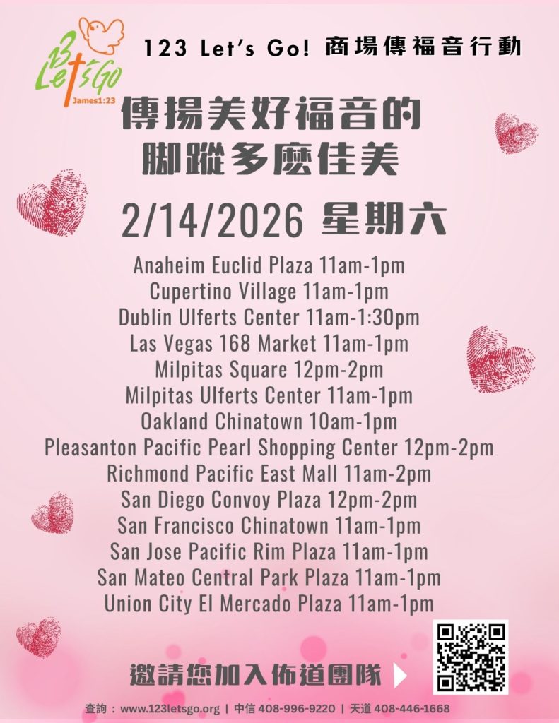 下一次 123 Let’s Go 將於2/14/ 2026(星期六)舉行。 詳情請參閱 123 Let’s Go 網站