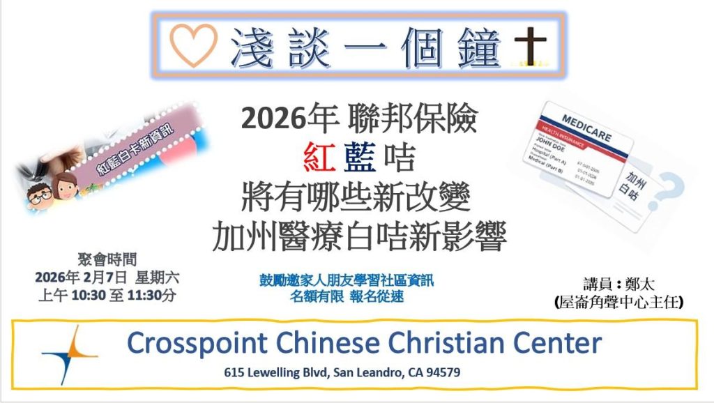 The Crosspoint Chinese Christian Center will host a healthcare workshop Saturday 2/7/2026 at 10:30AM on the recent policy changes of Medicare and related healthcare issues.
