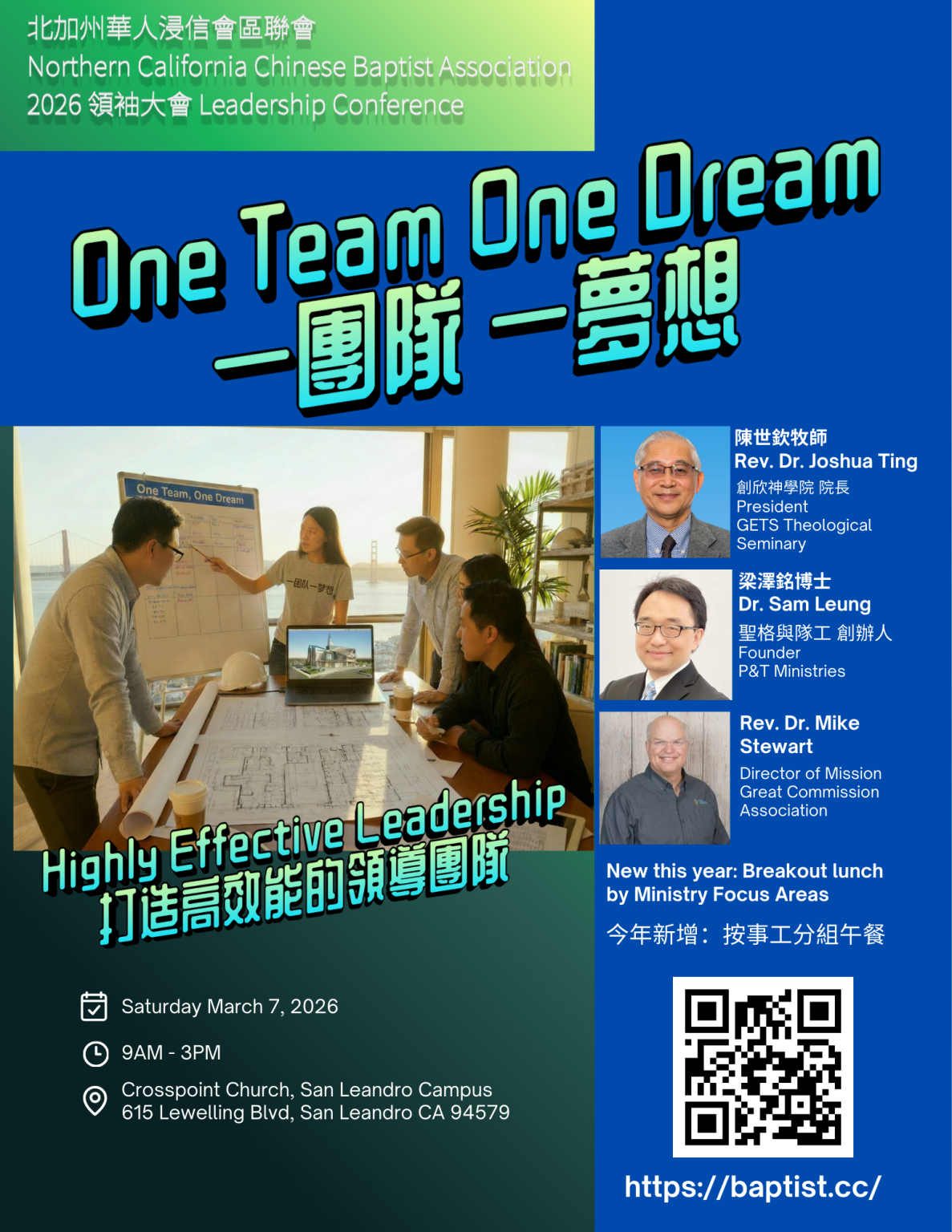 The Northern California Chinese Baptist Association’s annual leadership conference, “One Team, One Dream,” will be held on 3/7/2026, at Crosspoint San Leandro. Please reserve time to attend. Visit baptist.cc for details and registration.
