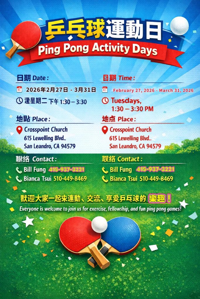 From 2/27/2026 to 3/31/2026, there will be Ping Pong Activity Days held every Tuesday 1:30-3:30PM at Crosspoint San Leandro. Everyone is welcome to join for exercise, fellowship, and fun ping pong games. Please contact Bill Fung for details.