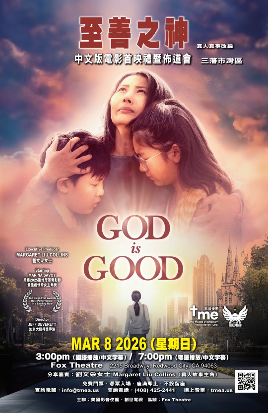 由真人真事改編的《God is Good 至善之神》中文版電影首映禮暨佈道會(三藩市灣區)將於3/8/2026於Fox Theatre下午3時及7時舉行。美國影音使團、創世電視主辦。詳情請看這裡。