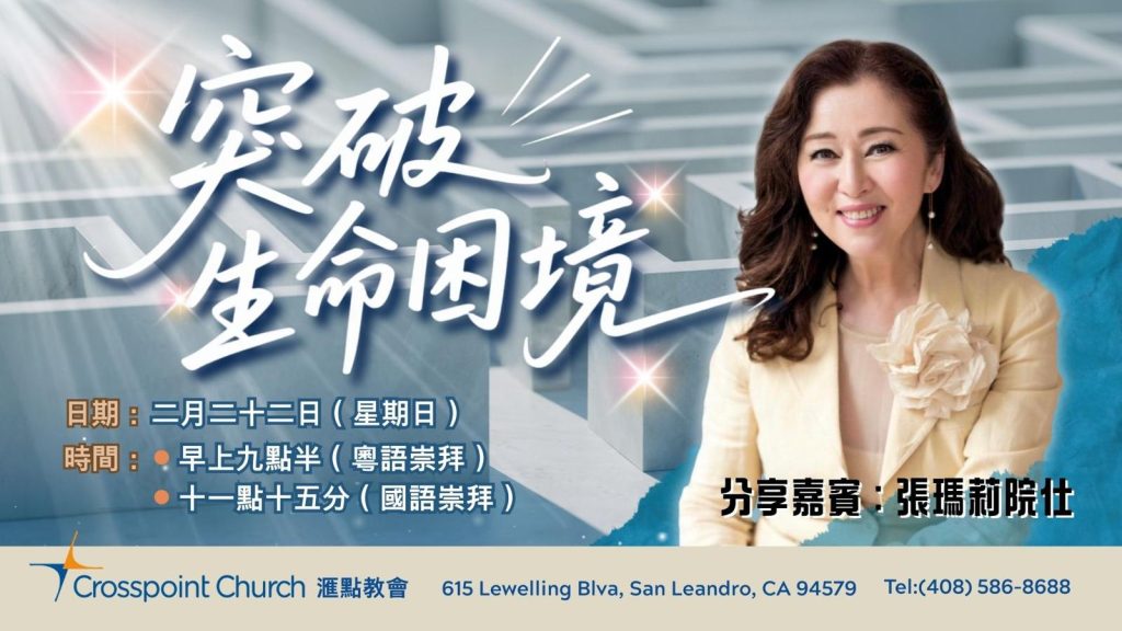 Mary Cheung will be visiting Crosspoint San Leandro on Sunday, 2/22/2026, to bring a gospel message “Overcoming Life’s Challenges” to both the Cantonese and Mandarin worship services. Please remember this special opportunity in your prayers and invite your family and friends to attend.