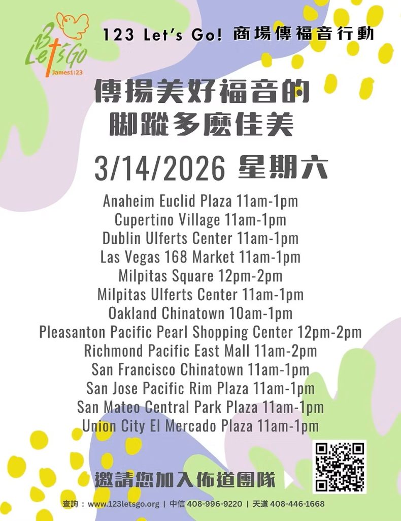 - 下一次 123 Let’s Go 商場佈道會預定於 3/14/2026日舉行。點選此處瞭解詳情 。